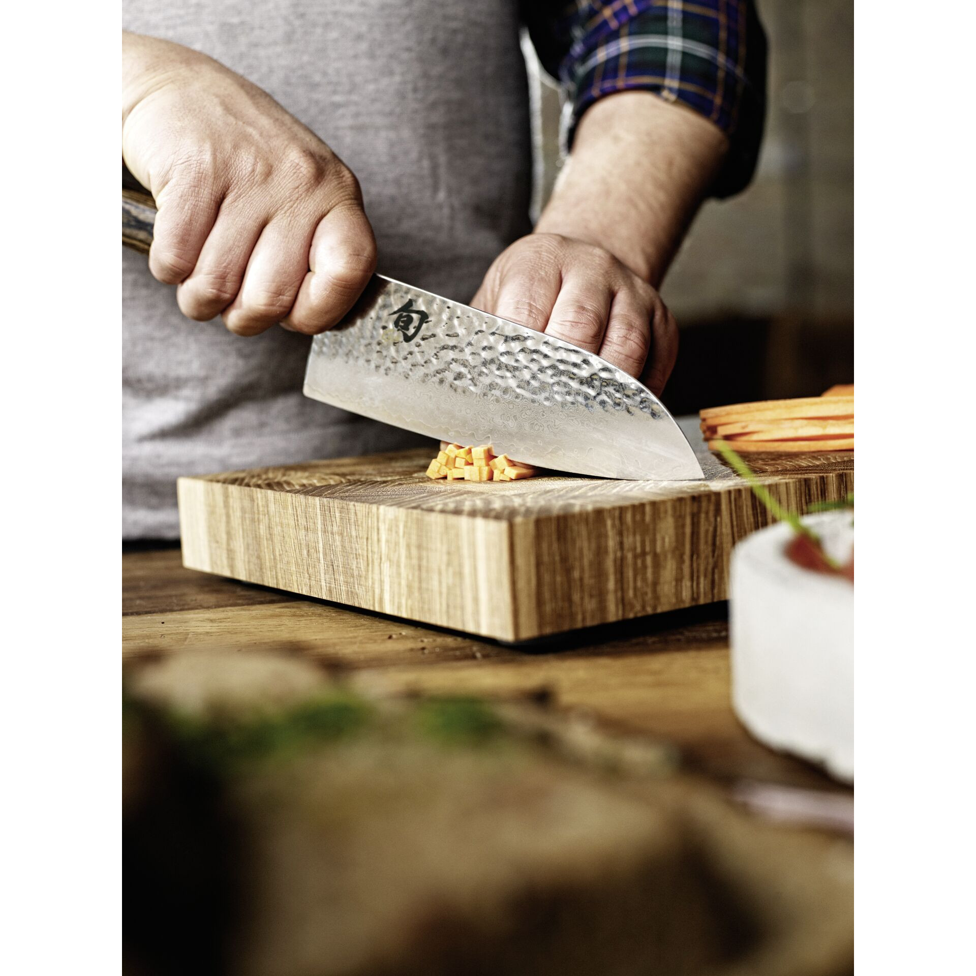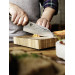 32-lagiger Damaszenerstahl je Seite, Innenlage aus VG-MAX Stahl, Hammerschlagoberfläche. Griff aus Pakkaholz in Walnussoptik. Geeignet für Links- u. Rechtshänder.