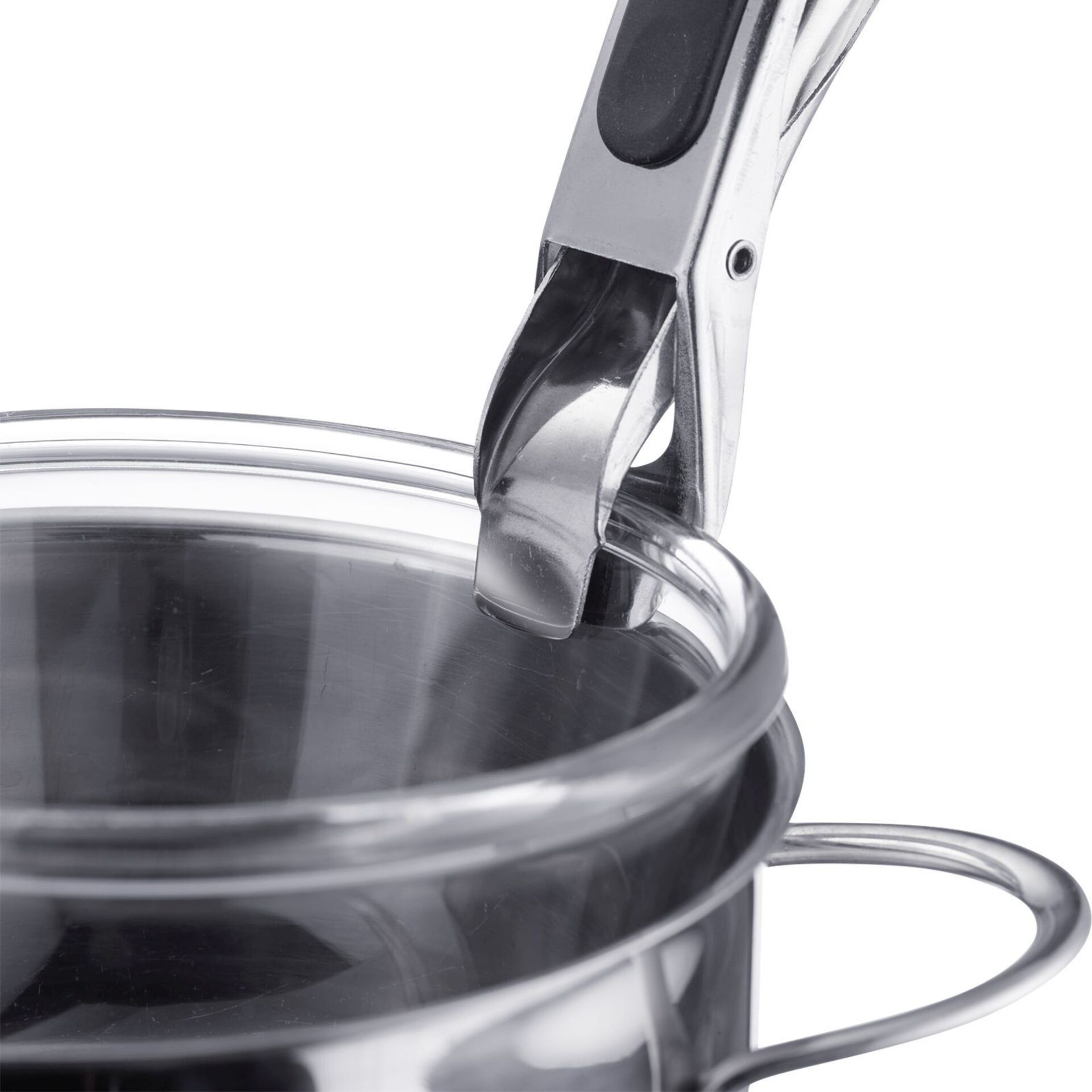 Edelstahl/Silikon. Schützt die Finger vor Verbrennungen. Ideal um Pizzableche und Back-/Auflaufformen im Ofen vorzuziehen, um heiße Teller zu bewegen etc. Nicht spülmaschinengeeignet.